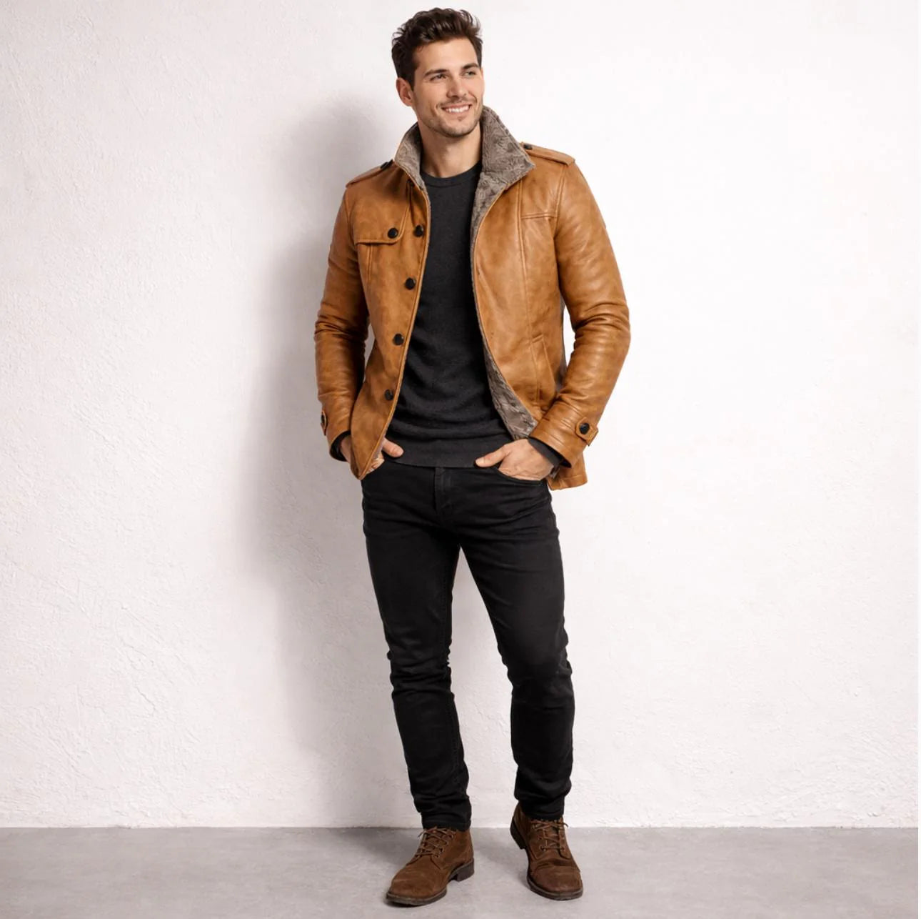 Edle Textur – Die Jacke hat eine hochwertige, lederähnliche Optik, die sowohl klassisch als auch trendsetzend ist.